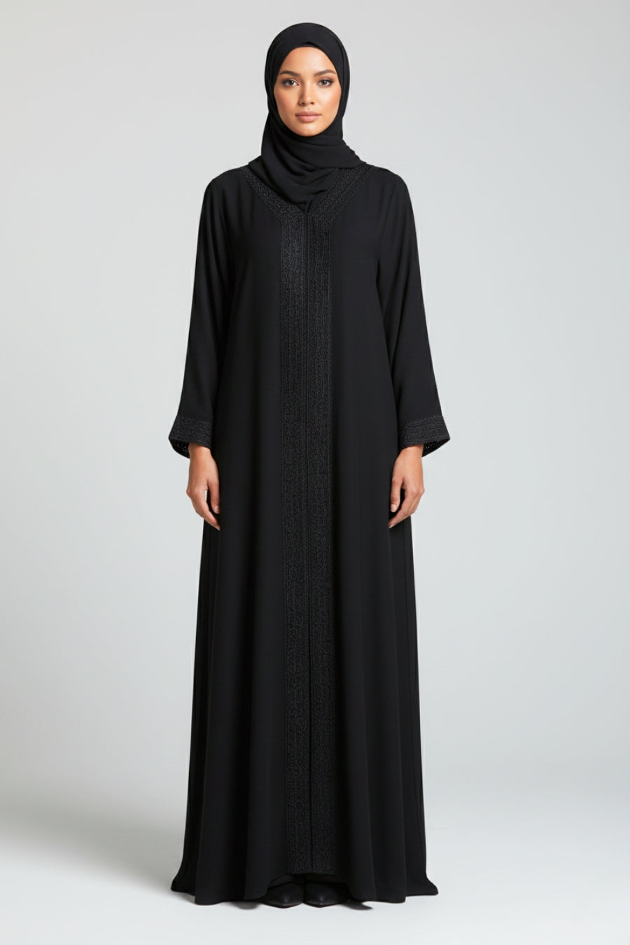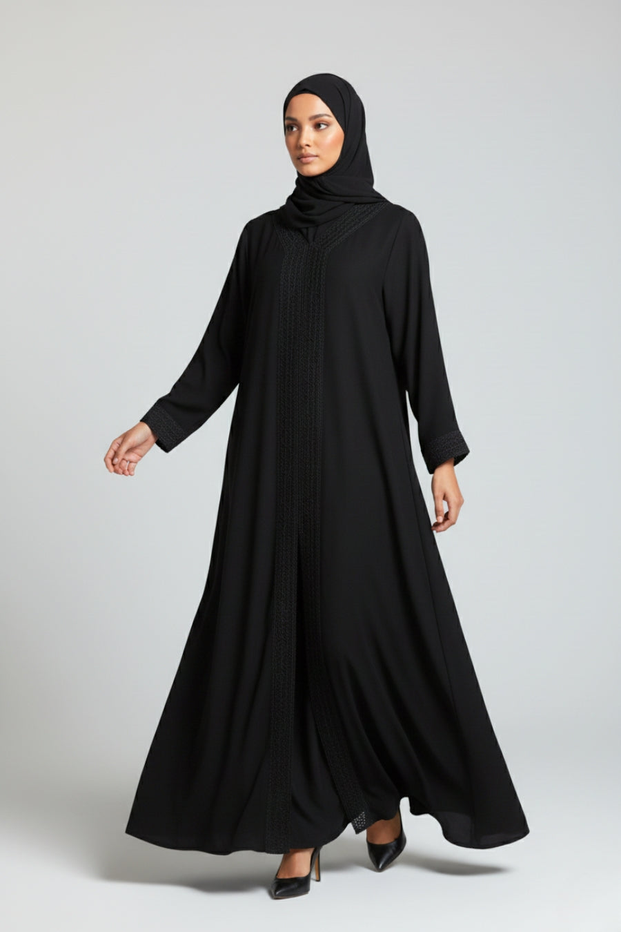 Timeless elegance meets delicate detail in our Black Abaya with Lace, a sophisticated staple designed for effortless modesty and grace. Crafted from high-quality, flowy fabric, this abaya features intricate lace accents that add a feminine touch while maintaining a classic, understated silhouette.